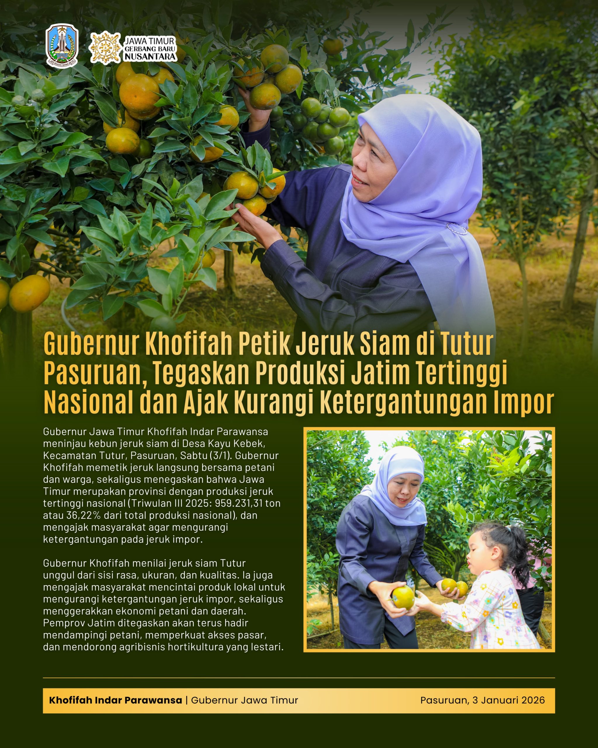Harian Cakrawala – PASURUAN, 4 JANUARI 2026, Gubernur Jawa Timur Khofifah Indar Parawansa memanfaatkan momen libur Tahun Baru 2026 dengan mengunjungi sentra jeruk siam di Desa Kayu Kebek, Kecamatan Tutur, Kabupaten Pasuruan, Sabtu (3/1).