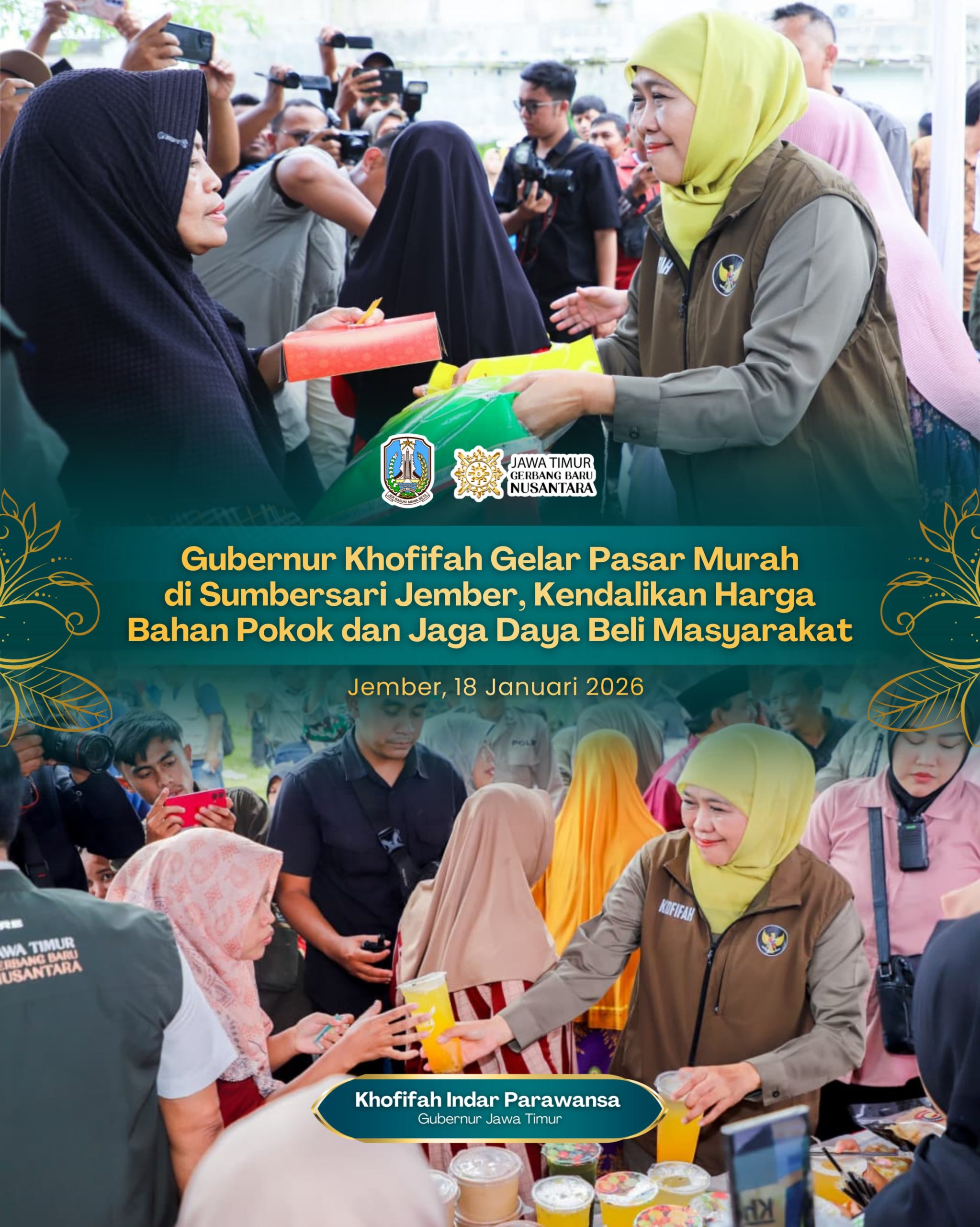 Harian Cakrawala – Jember , 19 JANUARI 2026, Gubernur Jawa Timur Khofifah Indar Parawansa terus menggencarkan program Pasar Murah di tengah dinamika harga pangan yang cenderung fluktuatif. Kali ini, Pasar Murah kelima pada tahun 2026 digelar di Kelurahan Tegalgede, Kecamatan Sumbersari, Minggu (18/1).
