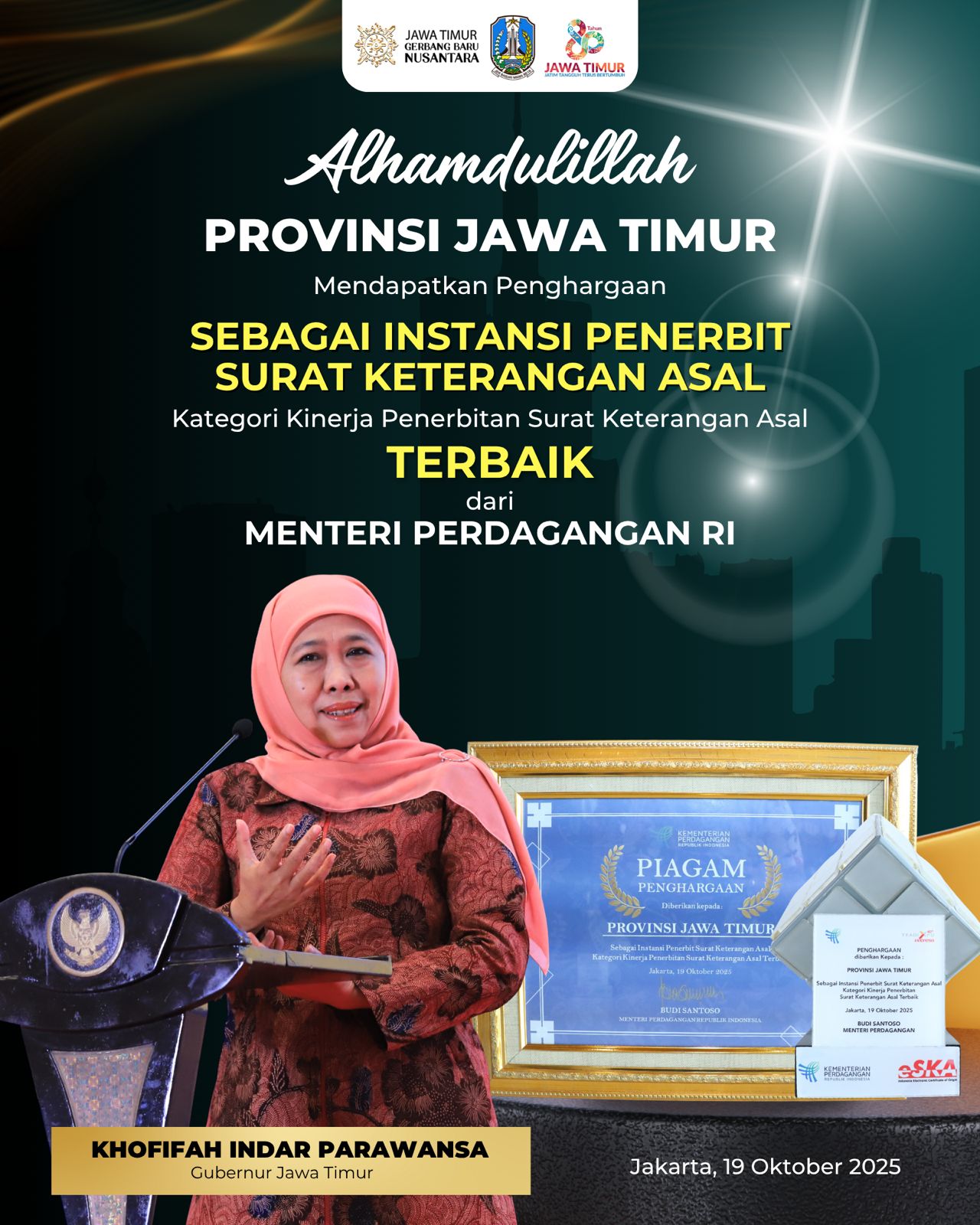Penghargaan ini diberikan kepada Pemprov Jatim atas kinerja terbaik dalam penerbitan Surat Keterangan Asal (SKA) atau _Certificate of Origin_ (COO) yang merupakan dokumen wajib eksportir untuk mengurangi/membebaskan tarif bea masuk di negara tujuan ekspor.