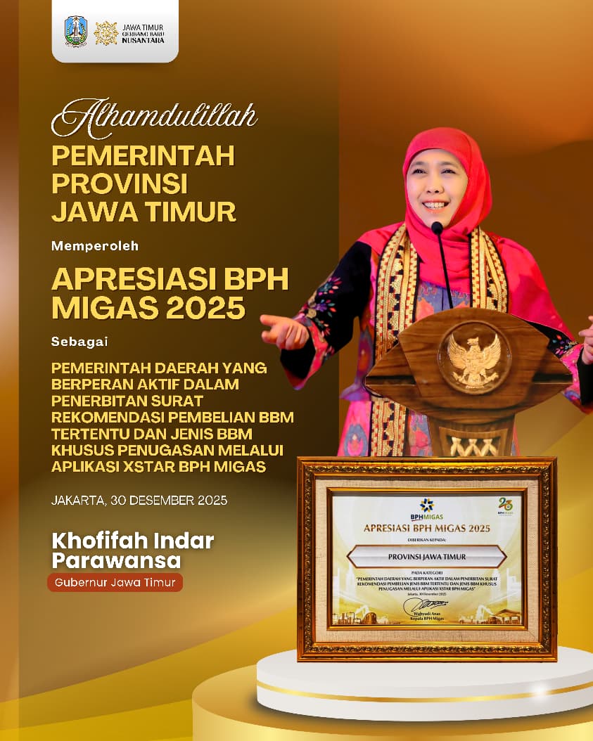 Penghargaan diterima langsung oleh Gubernur Jatim Khofifah Indar Parawansa yang diwakilkan oleh Kepala Dinas ESDM Jatim Aris Mukiyono pada acara Apresiasi BPH Migas 2025 di Ballroom Puri Agung, Hotel Grand Sahid Jaya, Jakarta Pusat, Selasa (30/12) malam.