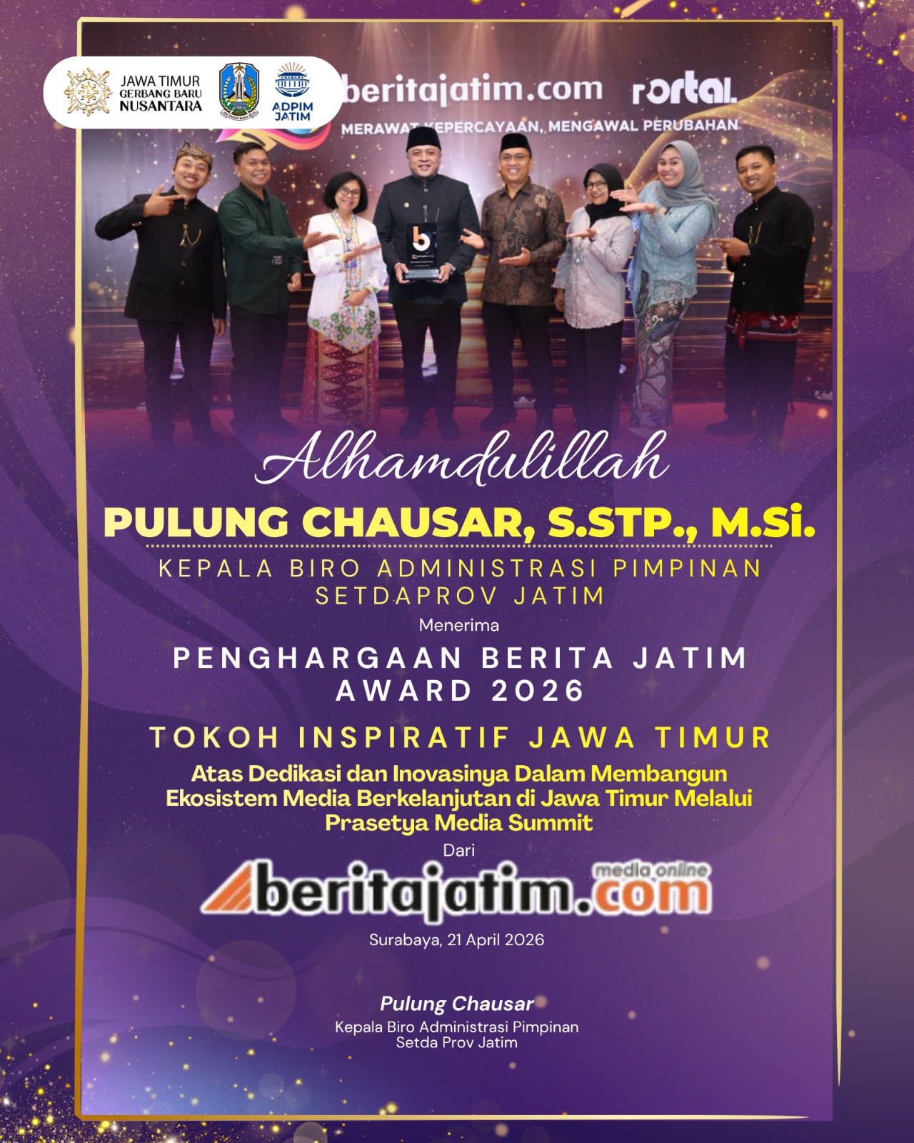 Harian Cakrawala – SURABAYA, 21 APRIL 2026,  Dedikasi, kepemimpinan, dan inovasi dalam membangun komunikasi publik yang adaptif dan berkelanjutan mengantarkan Kepala Biro Administrasi Pimpinan Sekretariat Daerah Provinsi Jawa Timur, Pulung Chausar, meraih Beritajatim.com Award 2026 kategori Tokoh Inspiratif Jawa Timur.
