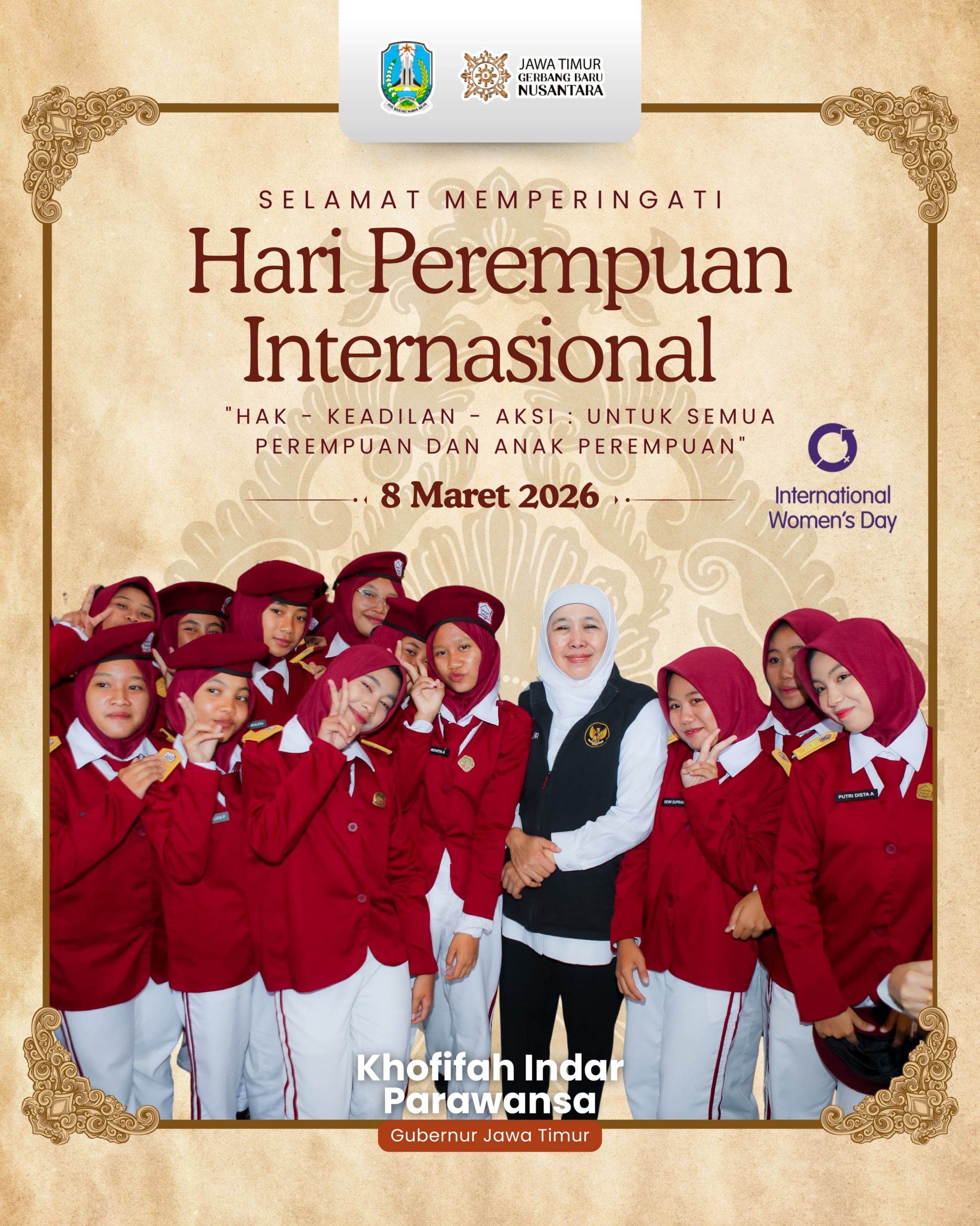 Harian Cakrawala – SURABAYA, 8 MARET 2026, Bertepatan dengan peringatan Hari Perempuan Internasional (International Women’s Day) 2026, Gubernur Jawa Timur Khofifah Indar Parawansa menegaskan pentingnya penguatan perlindungan serta pemberdayaan perempuan agar dapat berperan lebih optimal dalam pembangunan daerah maupun nasional.