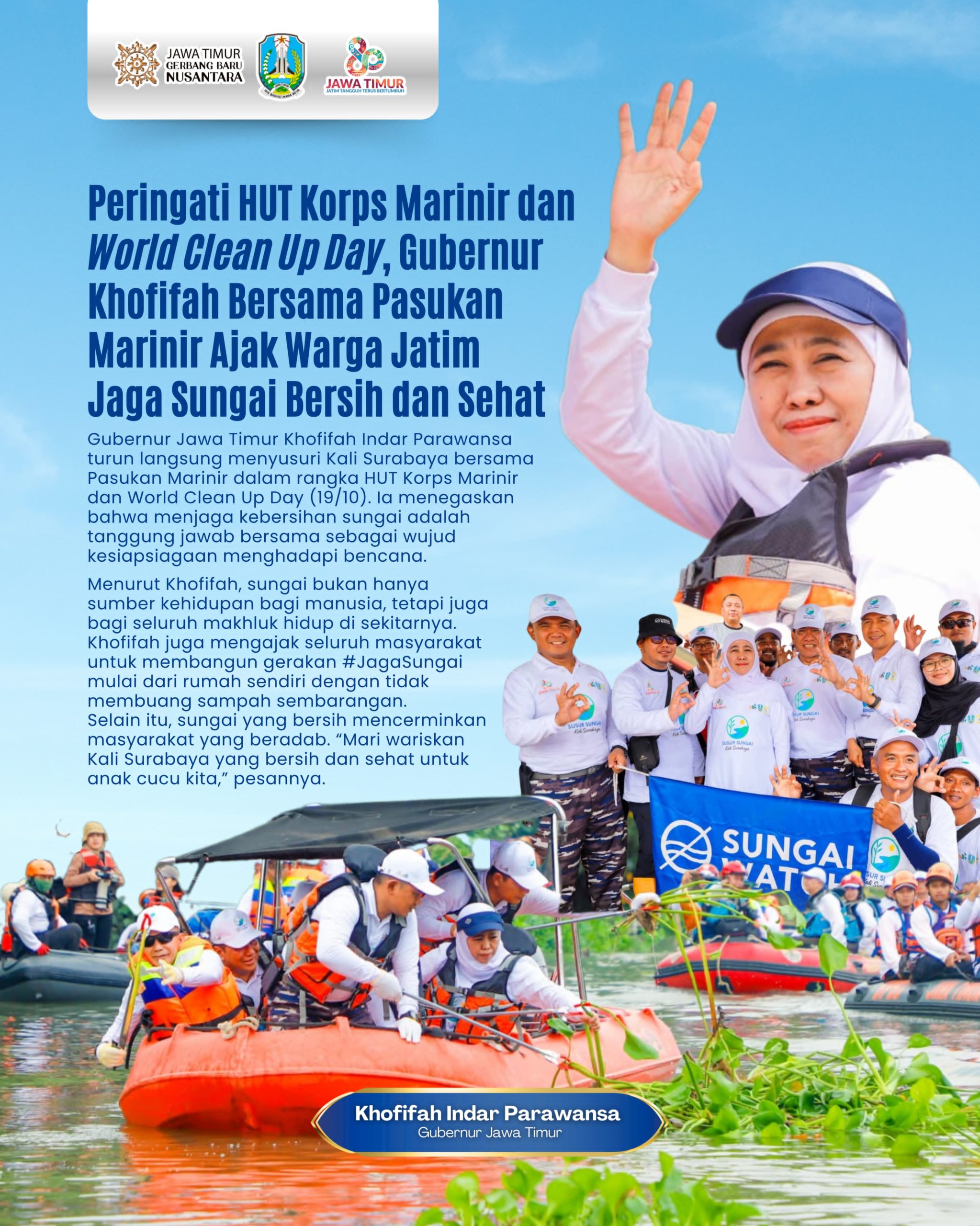 “Dalam momentum Hari Jadi ke 80 Provinsi Jatim dan World Clean Up Day serta HUT Korps Marinir ini, ayo kita semua jaga lingkungan dan sungai kita. _World clean up day_ dilakukan di banyak titik berbasis sungai baik manual maupun menggunakan alat berat. Sungai bukan hanya sumber kehidupan bagi manusia, tetapi juga bagi seluruh makhluk hidup di sekitar kita,” ujar Khofifah.