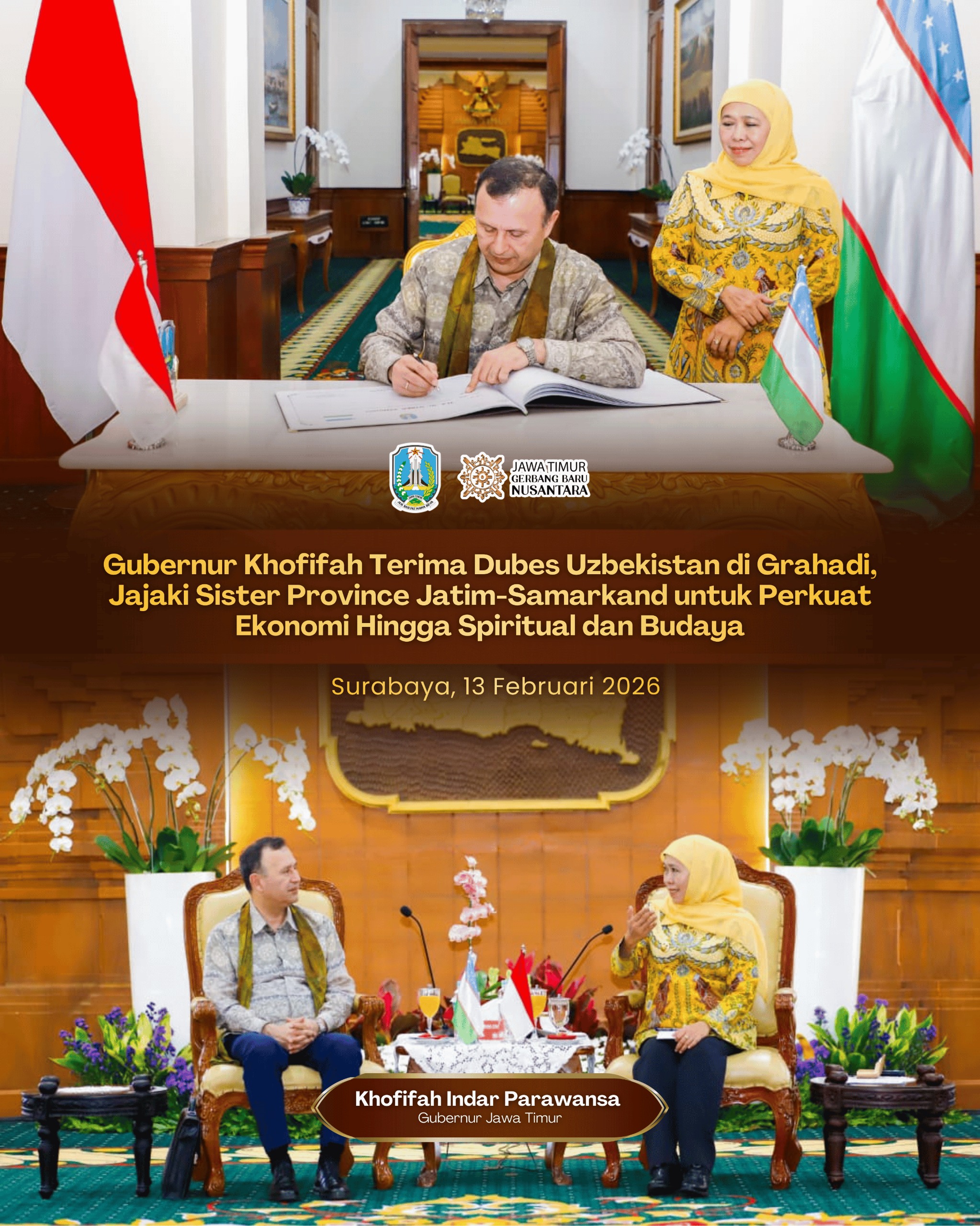 Harian Cakrawala – SURABAYA, 14 FEBRUARI 2026, Gubernur Jawa Timur Khofifah Indar Parawansa menjajaki peluang kerja sama _sister province_ antara Jawa Timur dengan Samarkand, yakni kota tertua di Asia Tengah dan terbesar kedua di Uzbekistan.