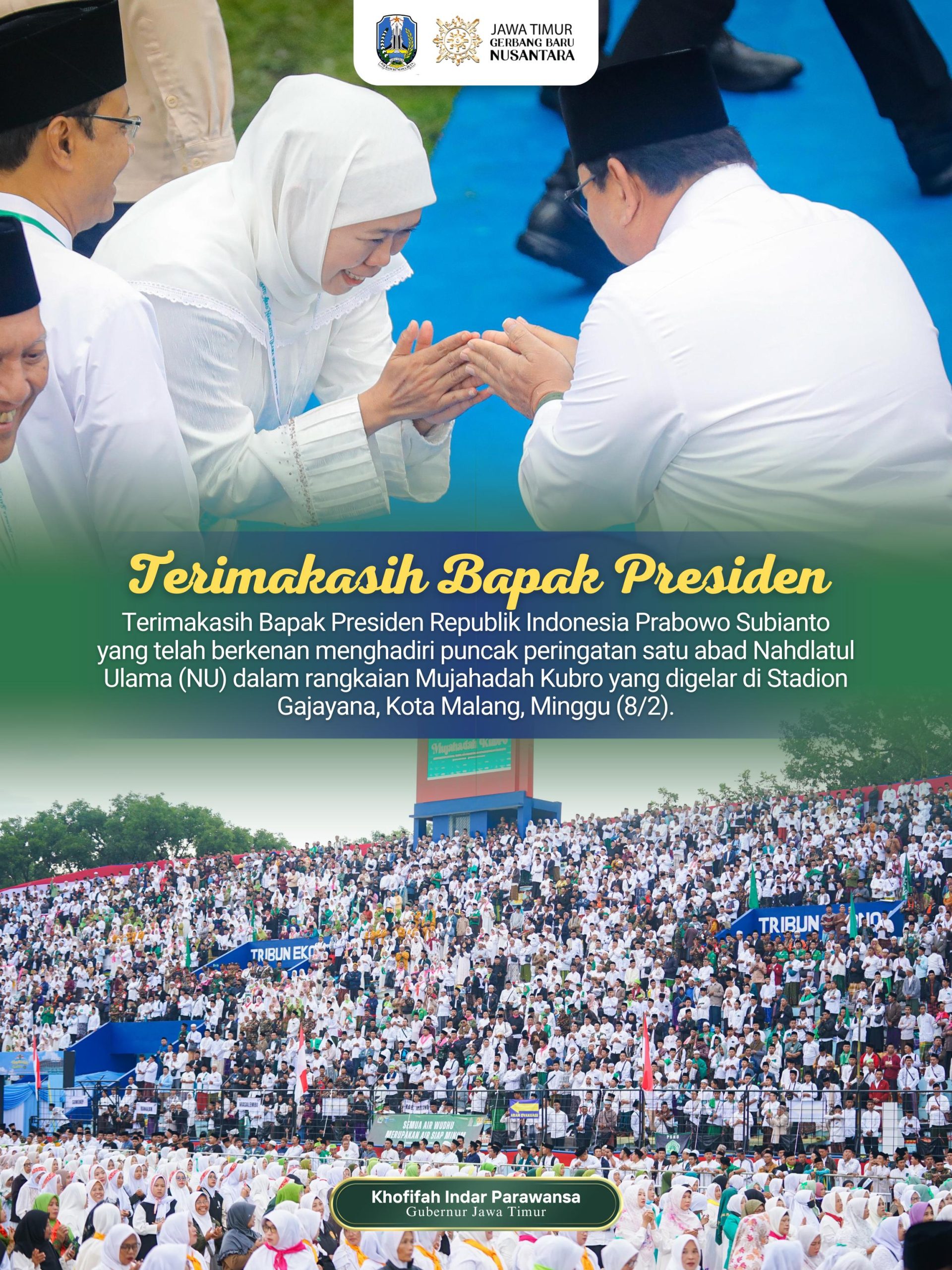 Senada dengan Presiden, Gubernur Khofifah menegaskan bahwa Nahdlatul Ulama telah membuktikan diri sebagai organisasi keagamaan dan kebangsaan yang mampu bertahan dan terus relevan selama satu abad perjalanan bangsa Indonesia. NU dinilai konsisten menjaga tradisi, toleransi, serta berkontribusi nyata dalam pembangunan peradaban nasional.