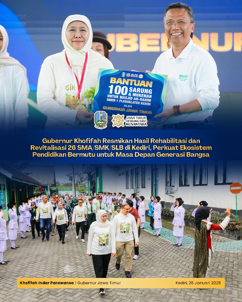 Harian Cakrawala – KEDIRI, 27 JANUARI 2026, Gubernur Jawa Timur Khofifah Indar Parawansa meresmikan hasil rehabilitasi dan revitalisasi 26 SMA, SMK, dan SLB negeri maupun swasta di Kabupaten dan Kota Kediri, Minggu (25/1), sebagai bagian dari transformasi pendidikan Jawa Timur yang berkelanjutan.