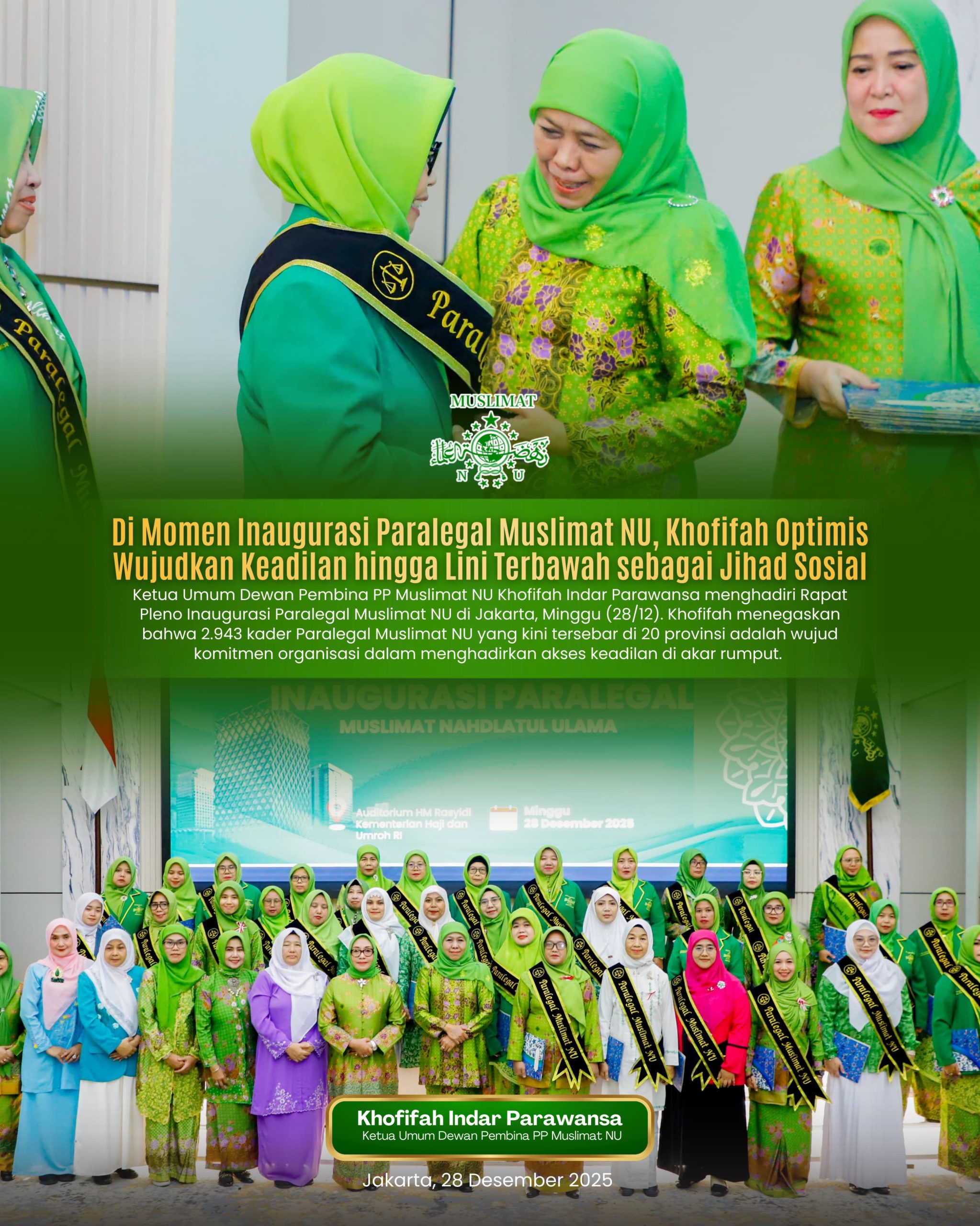 Harian Cakrawala – JAKARTA, 29 DESEMBER 2025, Ketua Umum Dewan Pembina PP Muslimat NU, Khofifah Indar Parawansa secara resmi mengukuhkan jajaran Paralegal Muslimat NU dalam sebuah prosesi inaugurasi yang digelar di Auditorium KH.M. Rasjidi Kementerian Agama RI pada Minggu (28/12).