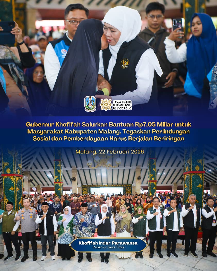 Harian Cakrawala – MALANG, 22 FEBRUARI 2026, Gubernur Jawa Timur Khofifah Indar Parawansa terus memperkuat perlindungan sosial sekaligus mendorong pemberdayaan ekonomi masyarakat secara berkelanjutan melalui penyaluran bantuan sosial dan tali asih pilar sosial senilai Rp7.050.325.000 bagi masyarakat di Pendopo Kabupaten Malang, Minggu (22/2).