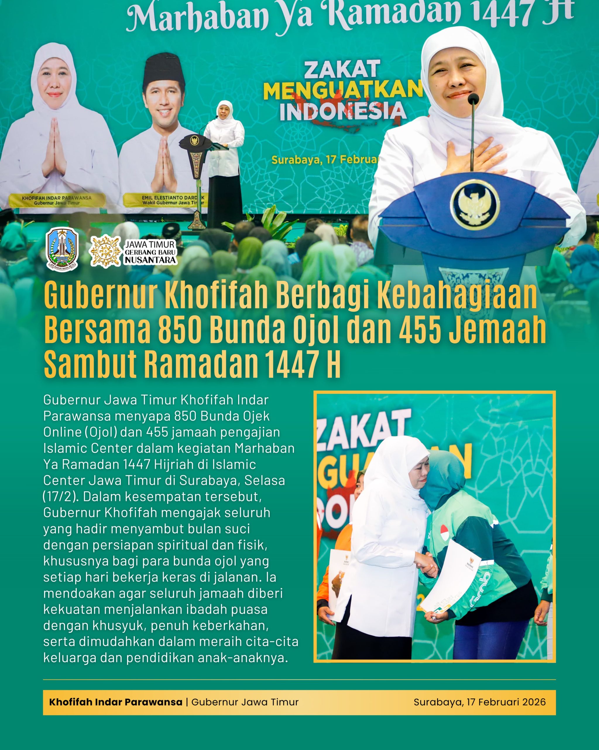 “Selamat menyambut bulan Ramadan 1447 Hijriah, mudah-mudahan kuat puasanya, bisa menjalankan ibadah Ramadan dengan khusyuk dan penuh keberkahan,” ujar Gubernur Khofifah.