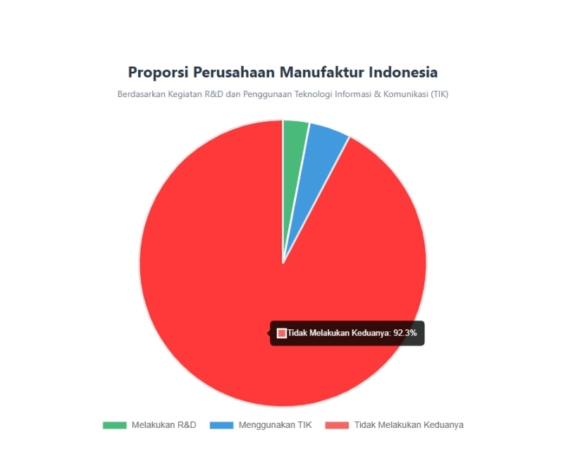 Indonesia, sebaliknya, masih sangat bergantung pada komoditas primer. Meski pemerintah gencar mempromosikan hilirisasi (downstreaming), implementasinya masih tersendat. Data menunjukkan bahwa hanya 3% perusahaan manufaktur menengah-atas di Indonesia yang melakukan R&D, dan 4,7% yang menggunakan teknologi informasi dan komunikasi (TIK). Artinya, 92,3% perusahaan tidak melakukan keduanya. Pengeluaran R&D Indonesia di bawah 0,3% dari PDB, jauh tertinggal dari Thailand (1,3%) dan Malaysia (1%).