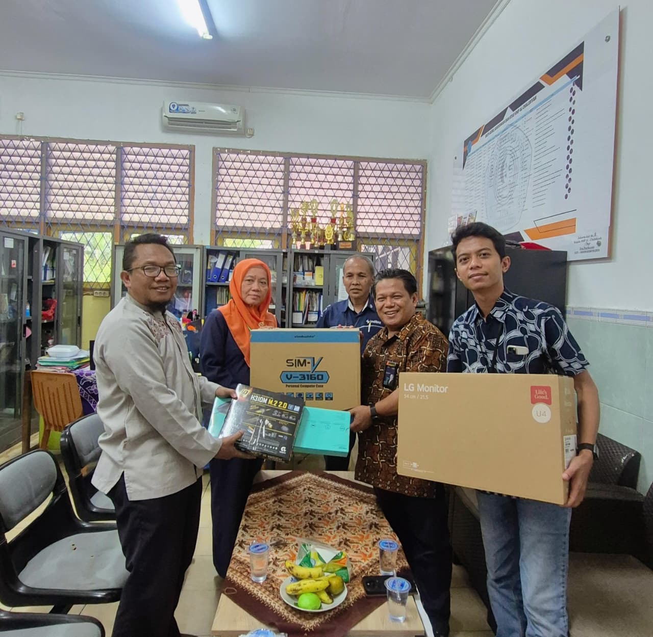 Kepala Sekolah, Ibu Nurhayati, menyambut langsung bantuan tersebut bersama Guru IT, Dede. Fasilitas baru ini akan memperkuat laboratorium komputer sekolah serta memperluas akses pembelajaran berbasis digital di lingkungan guru dan siswa.