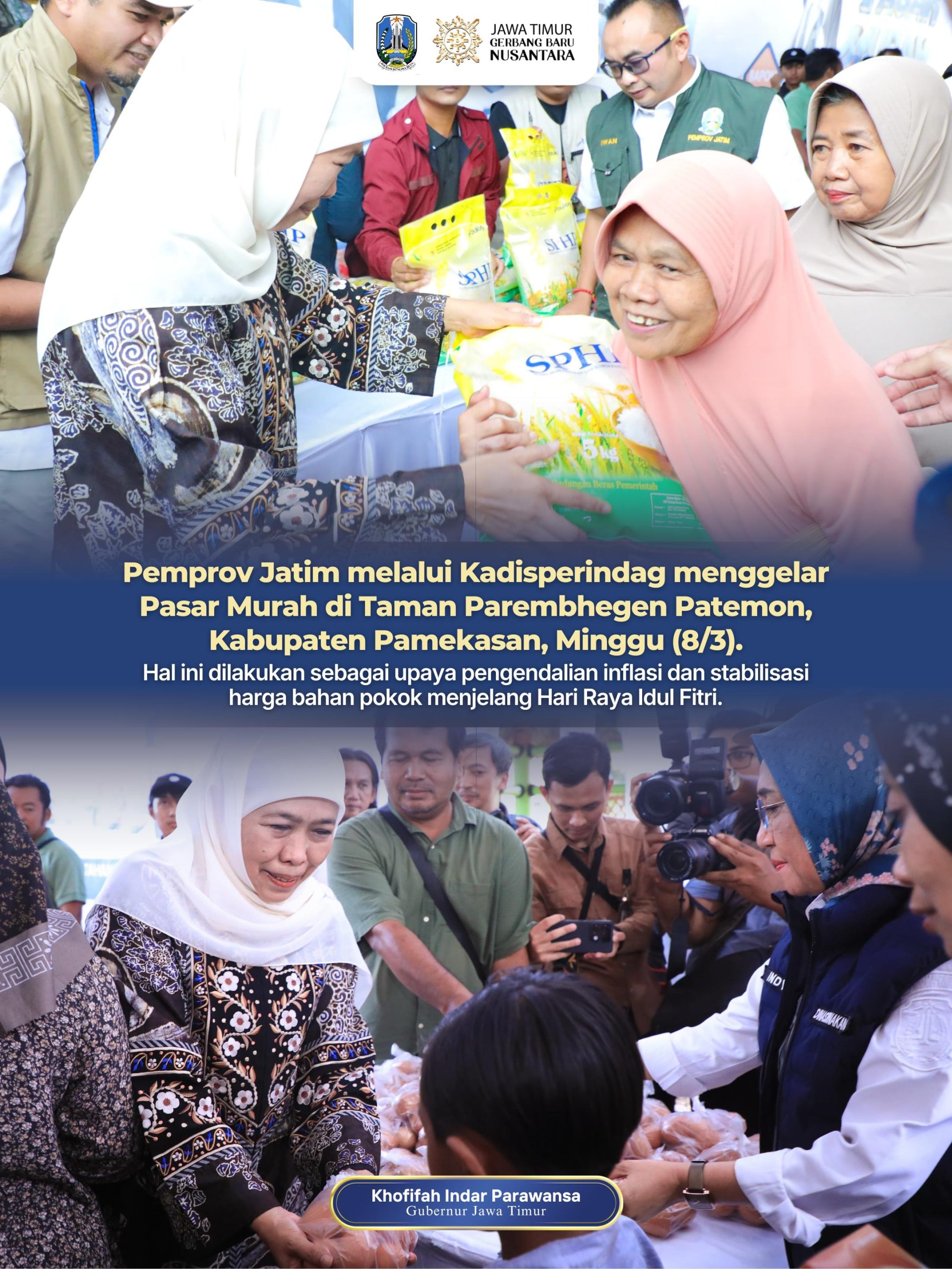 Harian Cakrawala – PAMEKASAN, 9 MARET 2026, Gubernur Jawa Timur Khofifah Indar Parawansa menggelar Pasar Murah di Taman Parembhegen Patemon, Kabupaten Pamekasan, Minggu (8/3). Hal ini dilakukan sebagai upaya pengendalian inflasi dan stabilisasi harga bahan pokok menjelang Hari Raya Idul Fitri.